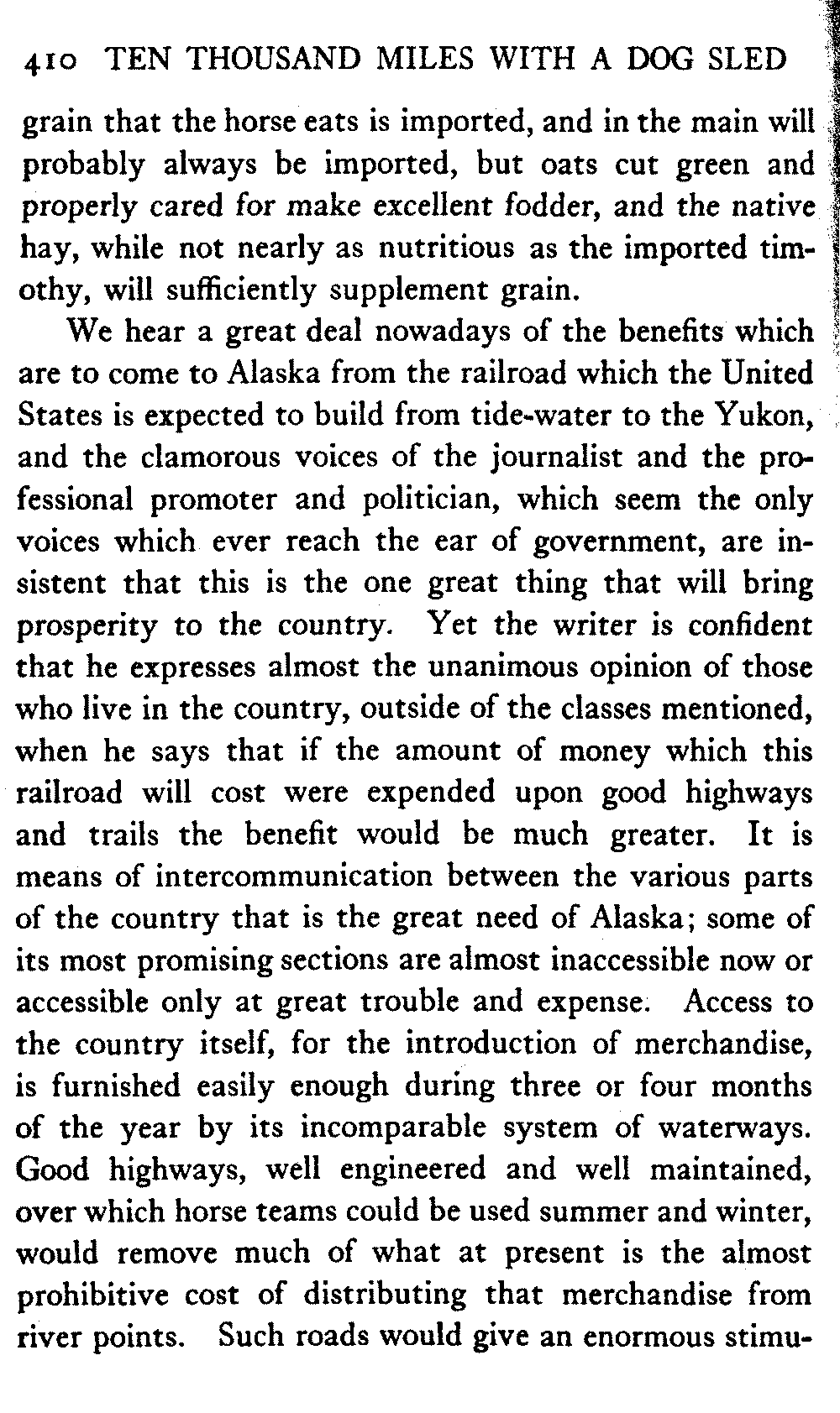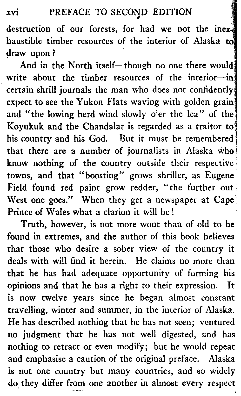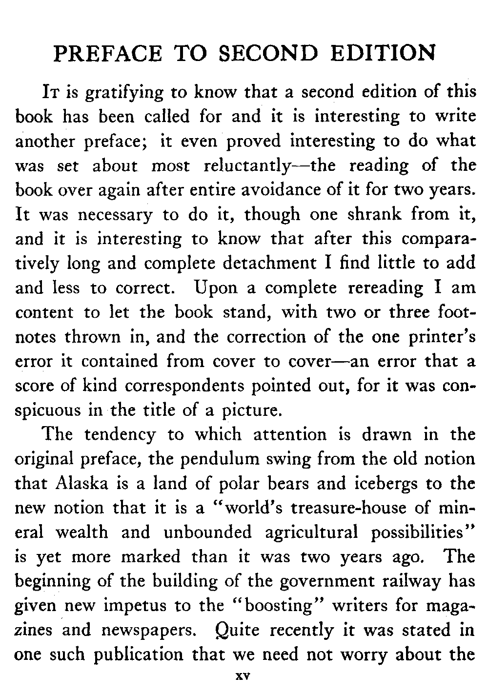 The tendency to which attention is drawn in the original preface, the pendulum swing from the old notion that Alaska is a land of polar bears and icebergs to the new notion that it is a "world's treasure-house of mineral wealth and unbounded agricultural possibilities" is yet more marked than it was two years ago. The beginning of the building of the government railway has given new impetus to the "boosting" writers for magazines and newspapers. Quite recently it was stated in one such publication that we need not worry about the[xvi] destruction of our forests, for had we not the inexhaustible timber resources of the interior of Alaska to draw upon?