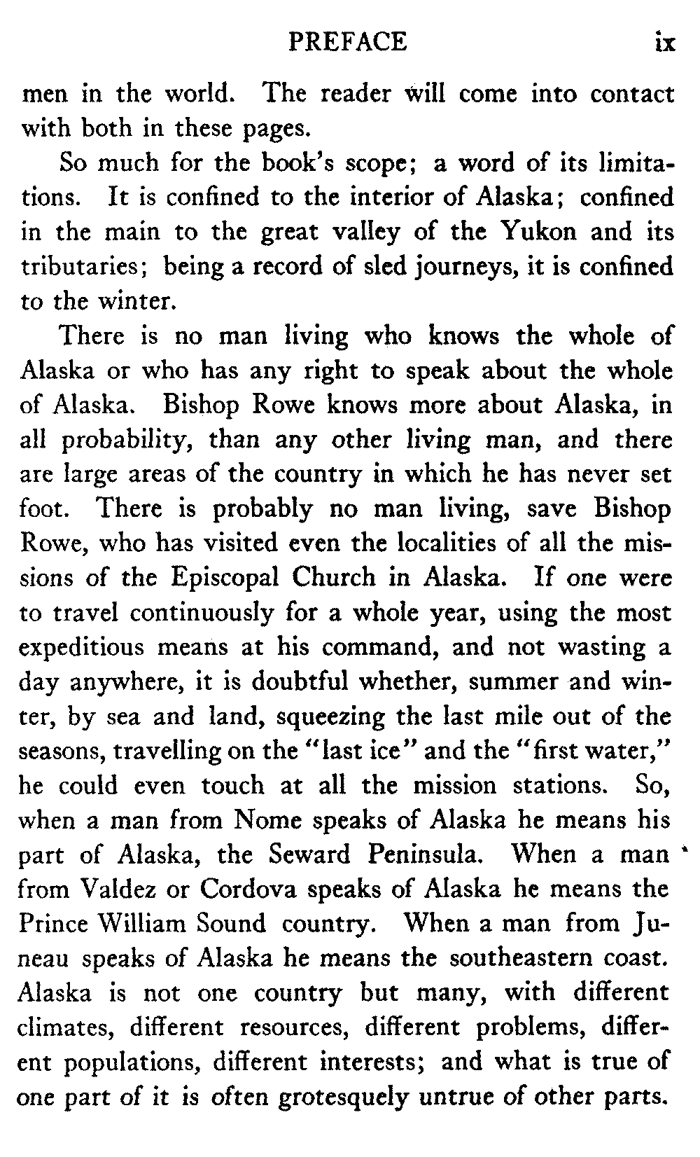 There is no man living who knows the whole of Alaska or who has any right to speak about the whole of Alaska. Bishop Rowe knows more about Alaska, in all probability, than any other living man, and there are large areas of the country in which he has never set foot. There is probably no man living, save Bishop Rowe, who has visited even the localities of all the missions of the Episcopal Church in Alaska. If one were to travel continuously for a whole year, using the most expeditious means at his command, and not wasting a day anywhere, it is doubtful whether, summer and winter, by sea and land, squeezing the last mile out of the seasons, travelling on the "last ice" and the "first water," he could even touch at all the mission stations. So, when a man from Nome speaks of Alaska he means his part of Alaska, the Seward Peninsula. When a man from Valdez or Cordova speaks of Alaska he means the Prince William Sound country. When a man from Juneau speaks of Alaska he means the southeastern coast. Alaska is not one country but many, with different climates, different resources, different problems, different populations, different interests; and what is true of one part of it is often grotesquely untrue of other parts.[x] This is the reason why so many contradictory things have been written about the country. Not only do these various parts of Alaska differ radically from one another, but they are separated from one another by almost insuperable natural obstacles, so that they are in reality different countries.