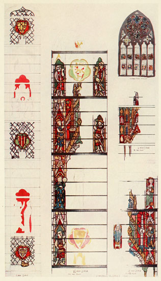 | 18. | Border and Shields, from Peter de Dene window, north aisle of nave, York Minster, with details from window in south aisle and sketch of clerestory window. Fourteenth century | 104 |