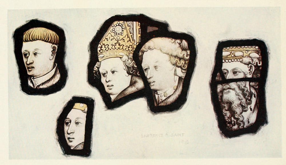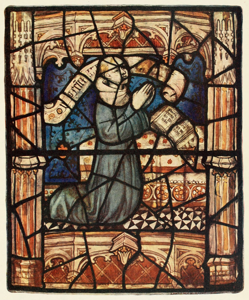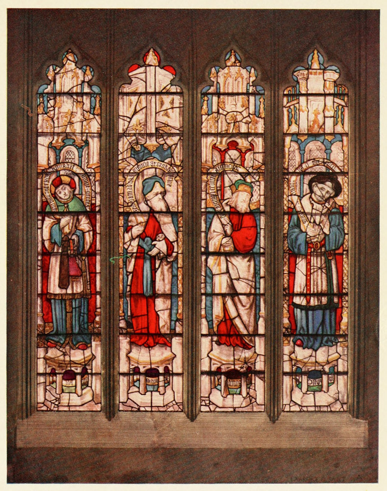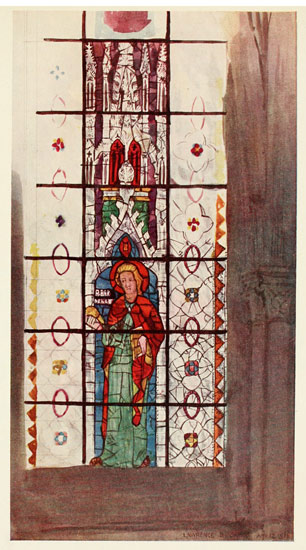 There is especial reason why we English should study the work of our own mediæval glass painters. They are the chief representatives of our primitive school of painting. It is true that there are English manuscripts in the museums, and there are the painted rood screens of Norfolk, including the vii superb example at Ranworth, and there is the portrait of Richard II. at Westminster; but of the painting which must once have covered the walls of our churches, there is little left but patches of faded colour clinging here and there to the plaster, and the occasional dim outline of a figure. Of our glass, on the other hand, in spite of four hundred years of destruction, a considerable quantity remains, and is worth far closer study than it has ever had.