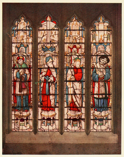 Fairford marks the end of mediæval stained glass in England. Conservative artists might still, as at Malvern and at St. Neots in Cornwall, try to carry on the older tradition, but their works are isolated survivals. The Fairford windows themselves represent, as I have said, a very short-lived phase in English glass, of which they are the most complete example, others being the fragments in Henry VII.'s Chapel at Westminster and the remains of Bishop Fox's glazing in Winchester Cathedral, now collected into the east clerestory window there. Flower's own work at King's College, Cambridge, twenty years later than Fairford, shows signs of change, and that of his 265 successors in the same building, as at Basingstoke, at Balliol College and elsewhere must be classed as wholly of the Renaissance. With Fairford, then, these notes on Stained Glass of the Middle Ages may fitly end.