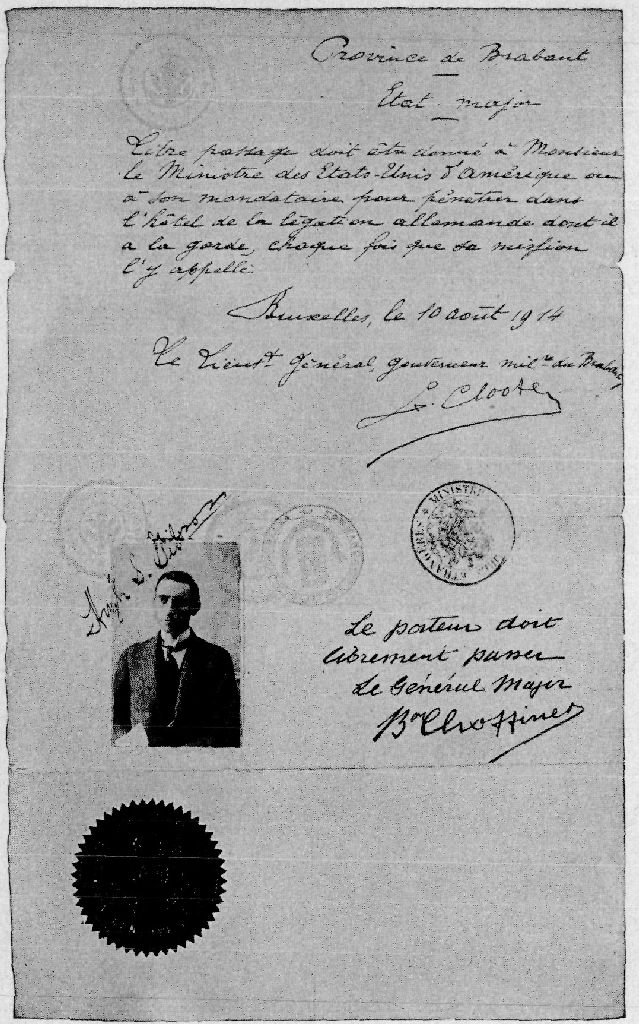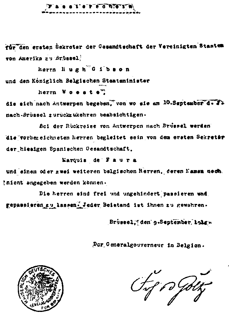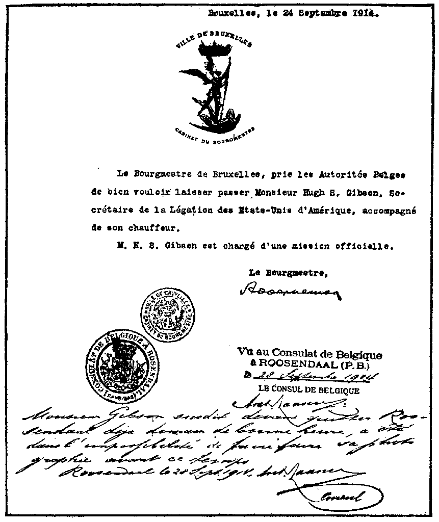 Le Bourgmestre de Bruxelles, prie les Autorités Belges de bien vouloir laisser passer Monsieur Hugh S. Gibsen, secrétaire de la Légation des Etats-Unis d'Amérique, accompagné de son chauffeur.