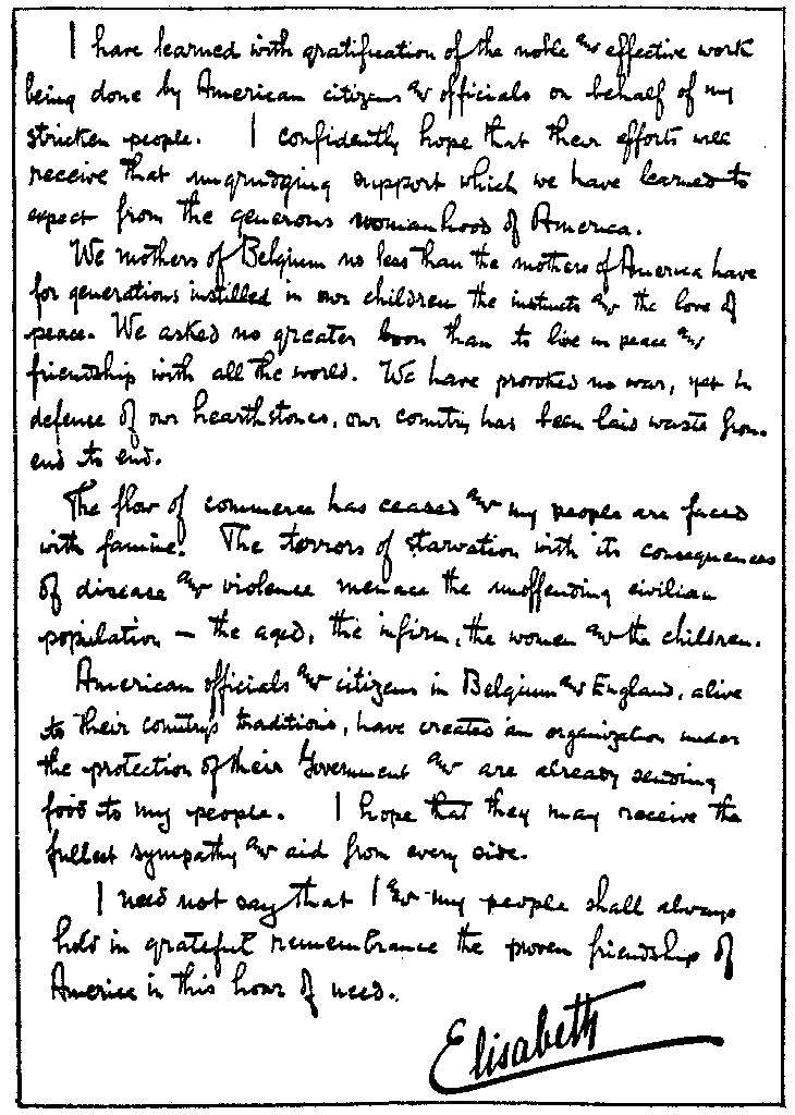 We mothers of Belgium no less than the mothers of America have for generations instilled in our children the instincts and the love of peace. We asked no greater boon than to live in peace and friendship with all the world. We have provoked no war, yet in defense of our hearthstones, our country has been laid waste from end to end.