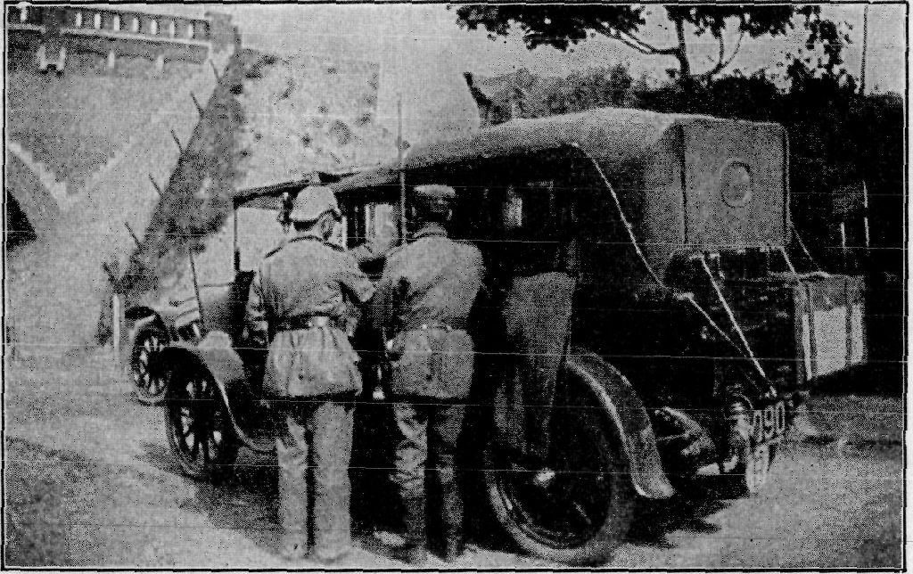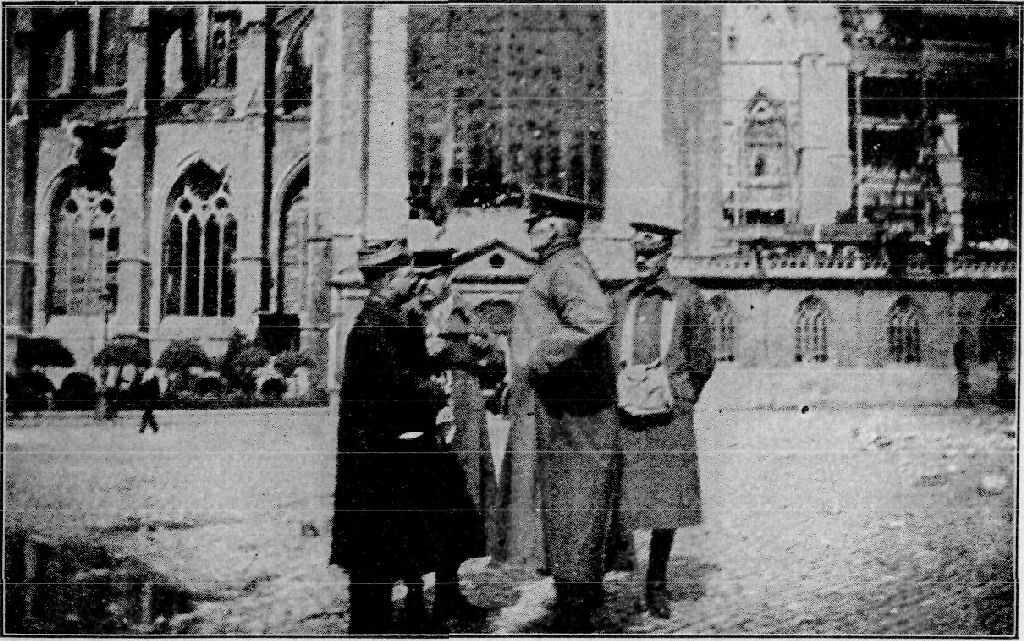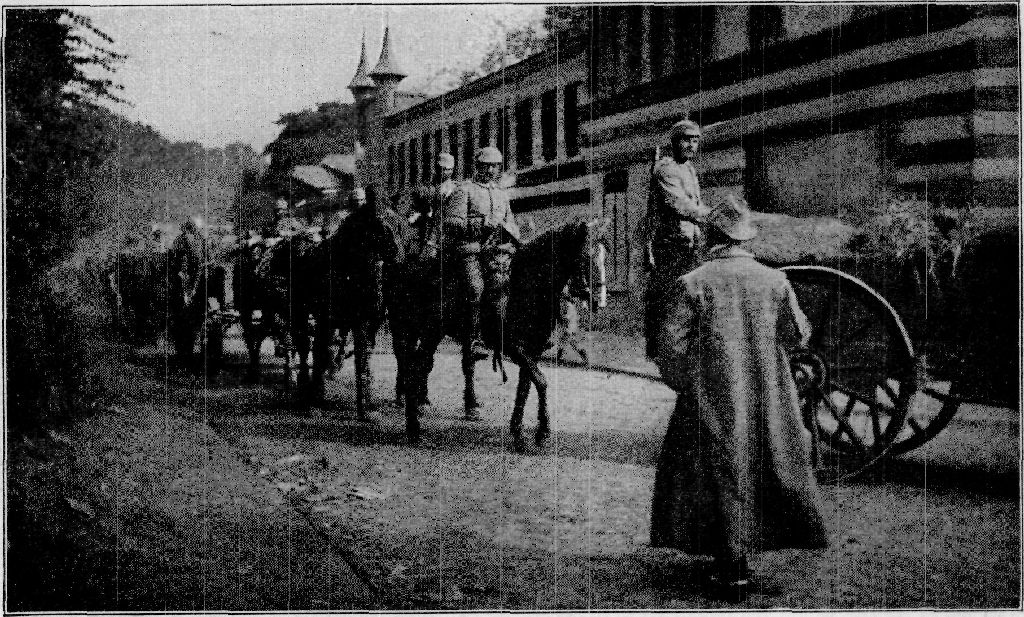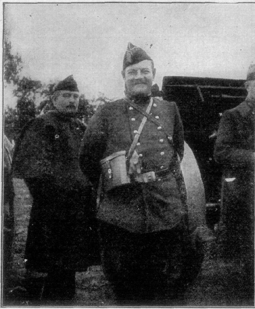 All the regular troops have been withdrawn from this part of the country and dispatched to the front, leaving the protection of the capital to the Garde Civique, who are patrolling the streets, to examine the papers of everybody who moves about. This is a sort of local guard made up of people who have not been called for active military service, but who have volunteered for local defense. They are from every class—lawyers and butchers and bakers and dentists and university professors. They have, of course, had little training for this sort of work, and have had only elementary orders to guide them. These they carry out to the letter. There are detachments of them at all sorts of strategic points in the city where they hold up passing vehicles to see who is inside. I have been stopped by them goodness knows how many times this day. They hold up the car, look inside, apologise, and explain good-naturedly that they are obliged to bother me, asking who I am, and after I have satisfied them with papers that any well-equipped spy would be ashamed of, they let me go on with more apologies. They rejoice in a traditional uniform topped off by a derby hat with kangaroo feathers on it. This is anything but martial in appearance and seems to affect their funny bone as it does mine.