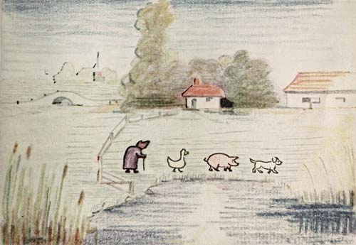 Once upon a time, many, many years ago, there lived a very old woman and her name was Mrs. Tubbs. She lived on a little farm, way off in the country. Her little house stood on the edge of the woods, not very far from a village with a little church, and a little river with a little bridge over it, flowed close by the house. There was a barn too for cows and horses, only the woman hadn’t any cows or horses; she lived all alone with a dog and a duck and a pig. The dog’s name was Peter Punk, the duck’s name was Polly Ponk, and the pig’s name was Patrick Pink. The old woman called them Punk, Ponk and Pink for short.