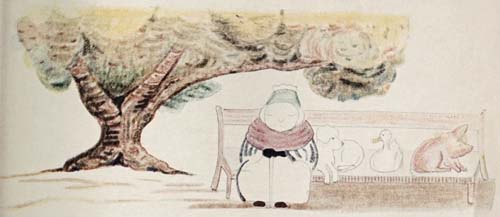 They walked a long, long way along the edge of the woods and at last when they saw a seat under a tree they all sat down to rest.