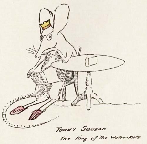 And presently there was a rustling sound in the grasses all around and a whispering sound in the bushes and a splashing sound from the water. And everywhere rats appeared, hopping and jumping towards him—big ones and little ones, black ones, grey ones, brown ones, piebald ones—families of them, hundreds of them—thousands—millions. And they gathered round Tommy Squeak the King-Rat in a great, great big circle. Their beady, black eyes looked very frightened when they saw a dog there but they didn’t run away because the king had called them.