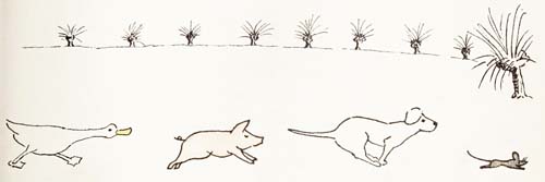 “Catch him!” said Ponk. “Perhaps he’ll be able to help.” And they all started running as hard as they could after the water-rat. Poor Tommy Squeak was dreadfully frightened at seeing a dog and a pig and a duck coming after him, and he made off for the river as fast as his legs would carry him. When he came to the river he jumped in with a splash and disappeared. Punk and Pink sat down on the grass and said,