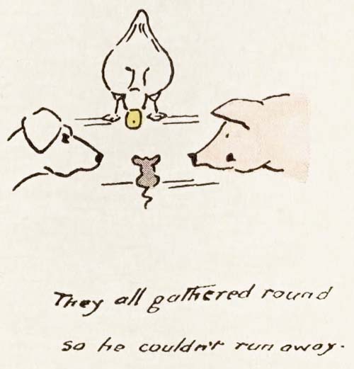 But Polly Ponk, running up behind, never stopped but dived into the river, swam under the water and just caught poor Mr. Squeak as he was popping into a hole way down at the bottom of the river. She pulled him up by his tail, carried him to the shore and put him on the grass. Then they all gathered round him so he couldn’t run away.