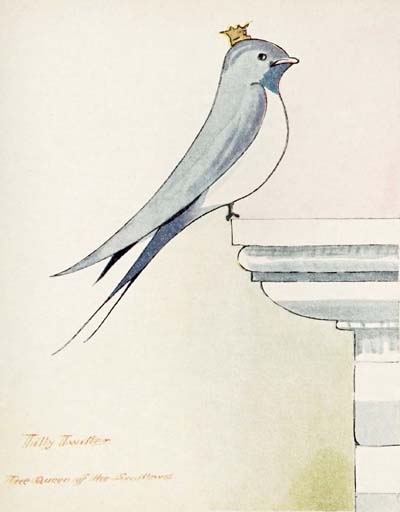 “Swallows,” she said, “many years ago, when I first built my mud nest under the eaves of this farm, I had five children in my nest. They were my first family and I was very proud of them. That was before I became the Queen of the Swallows. And being a very inexperienced mother I built the nest too small. When my children grew up there was not proper room for them. Philip—a very strong child—was always twisting and turning in the nest and one day he fell out. He bumped his nose badly on the ground but it was not far to fall and he was not much hurt. I was just going to fly down and try to pick him up when I saw a large weasel coming across the farm-yard to get him. My feathers stood up on the top of my head with fright. I flew to the farm-house window and beat upon the glass with my wings. An old woman came out. When she saw Philip on the ground and the weasel coming to get him she threw her porridge-spoon at the weasel, picked Philip up and put him back in my nest. That old woman’s name was Mrs. Tubbs. She has now been turned out of her house and a very stupid red-faced man is living on the farm in her place. We have got to do our best to turn him out and put Mrs. Tubbs back in her house, the same as she put my child back in his nest. So I have called you all together a week earlier than usual this year for our long journey to Africa, and before we leave England we have got to see what we can do. The first thing we’ll do is to stop up his chimney so his fire won’t burn. Then put mud all over the windows so the light will not come in. Bring all the straw from the barn and fill his bed-room with it. Take his best neck-tie and drop it in the river. And do everything you can to drive him out.”