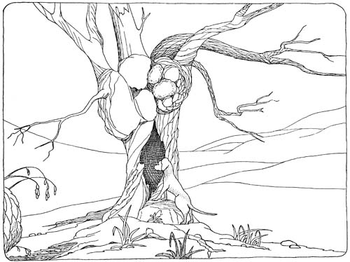 Presently, feeling hungry, he remembered he had hidden a ham-bone in the trunk of a tree behind the house some weeks ago and he went off to see if it was still there. When he got to the tree he stood up on his hind-legs and looked into the hole. A wasp flew out and stung him on the nose. He sat down on the grass and watched the tree for a minute and saw many wasps coming in and going out through the hole. Then he understood what had happened. Thousands of wasps had made a nest in the hollow tree.