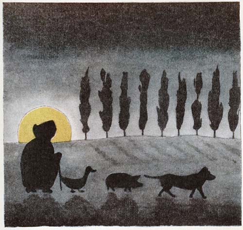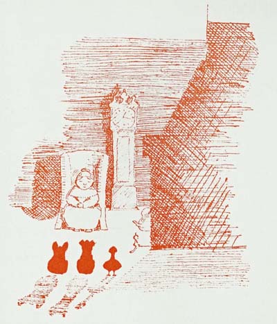 And so when the leaves were all fallen in the woods, and the trees stood bare waiting for the snow, they used to sit round the warm fire in the evenings toasting chestnuts and telling stories while the kettle steamed upon the hob and the wind howled in the chimney above. And they never had to leave the farm again and they all lived happily ever after.