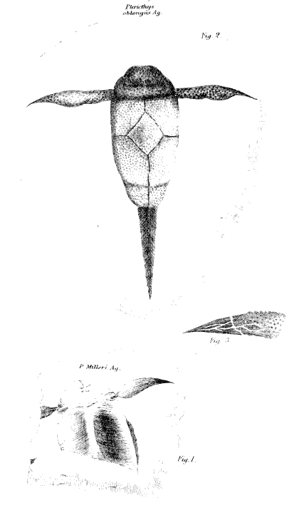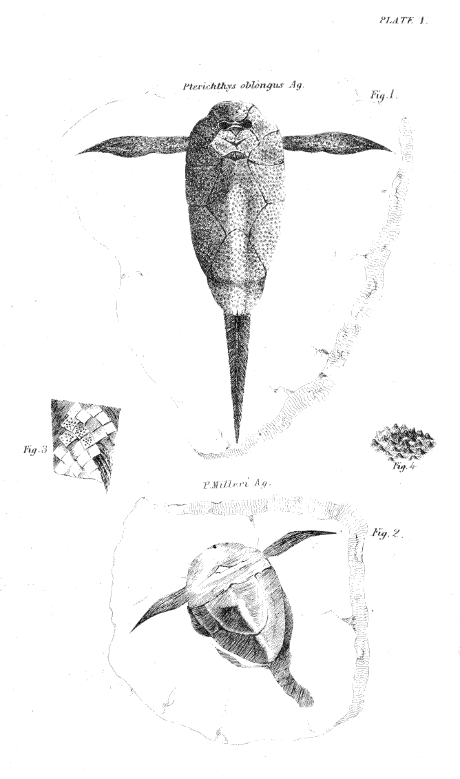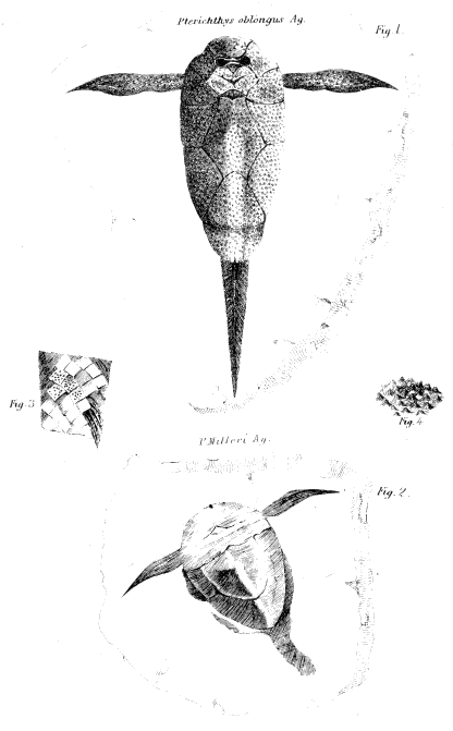 Plate I.—Fig. 1, Restoration of upper side of the elongated species of Pterichthys (P. oblongus,) referred to in page 47. Fig. 2, Pterichthys Milleri. Fig. 3, Part of tail of elongated species, showing portions of the original covering of rhomboidal scales. Fig. 4, Tubercles of Pterichthys magnified.