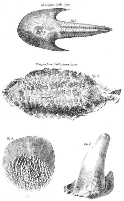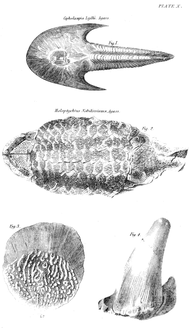 Plate X.—Fig. 1, Cephalaspis Lyellii, copied from Lyell's Elements of Geology, Fig. 2, Holoptychius nobilissimus, copied on a greatly reduced scale from Murchison's Silurian System, Fig. 3, Scale of Holoptychius, natural size. Fig, 4, Tooth of ditto, also natural size. These last drawn from specimens in the collection of Mr. Patrick Duff, of Elgin.