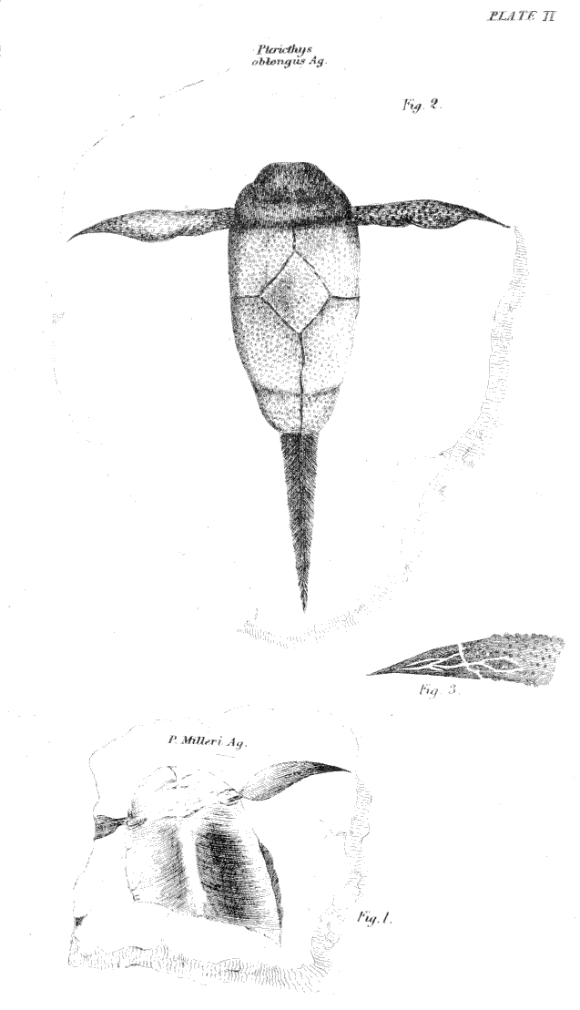 Plate II.—Fig. 2, Restoration of under side of Pterichthys oblongus. Fig. 1, A second specimen of Pterichthys Milleri. Fig. 3, Portion of wing, natural size.