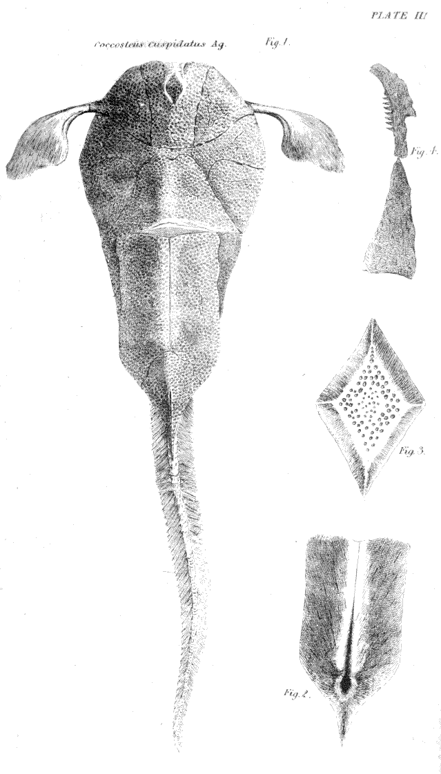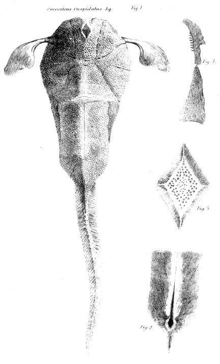 Plate III.—Fig. 1, Coccosteus cuspidatus. Fig. 2, Impression of inner surface of large dorsal plate. Fig. 3, Abdominal lozenge-shaped plate. Fig. 4, Portion of jaw, with teeth.