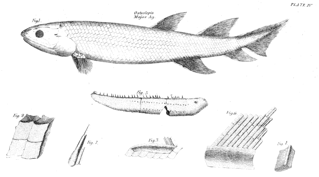 Plate IV.—Fig. 1, Restoration of Osteolepis major. Fig. 2, Scales from the upper part of the body magnified. Fig. 3, Large defensive scale which runs laterally along all the single fins. Fig. 4, Under side of scale, showing the attaching bar. Fig. 5, Enamelled and punctulated jaw of the creature. Fig. 6, Magnified portion of fin, showing the enamelled and punctulated rays.