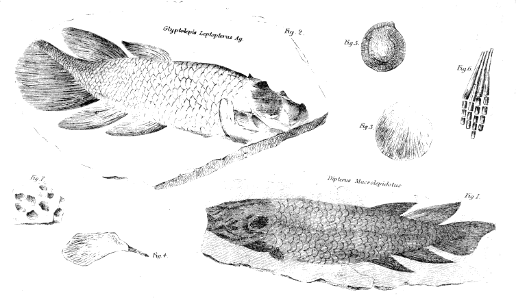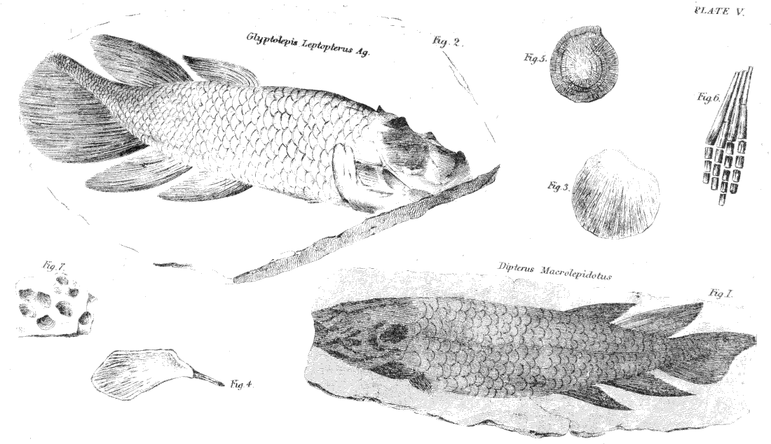 Plate V.—Fig. 1, Dipterus macrolepidotus. This figure serves merely to show the place of the fins and the general outline of the ichthyolite. All the specimens the writer has hitherto examined fail to show the minuter details. Fig. 2, Glyptolepis leptopterus. Fig. 3, Single scale of the creature, showing its rustic style of ornament. Fig. 4, Scale with a nail-like attachment. Fig. 5, Under side of scale. Fig. 6, Magnified portion of fin. Fig. 7, Shells of the Old Red Sandstone.