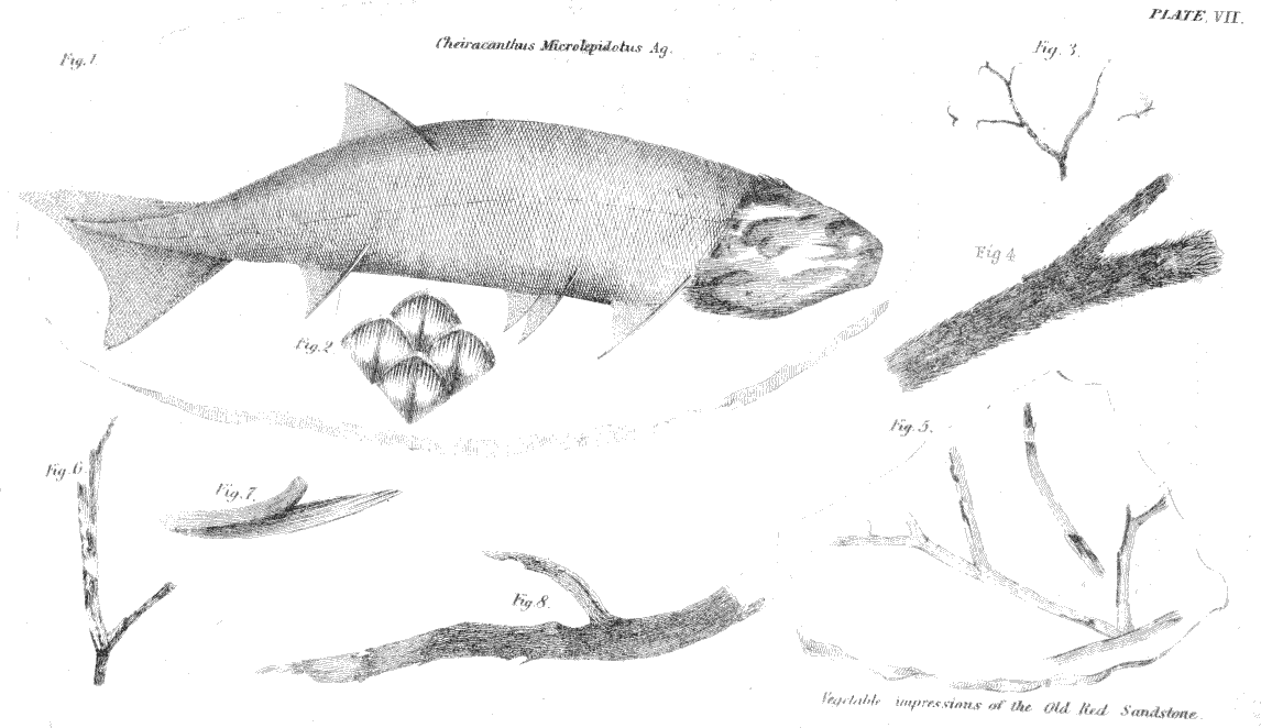 Plate VII.—Fig. 1, Cheiracanthus microlepidotus. Fig. 2, Magnified scales. Figs. 3, 4, 5, 6, 7, 8, Vegetable impressions of the Old Red Sandstone.