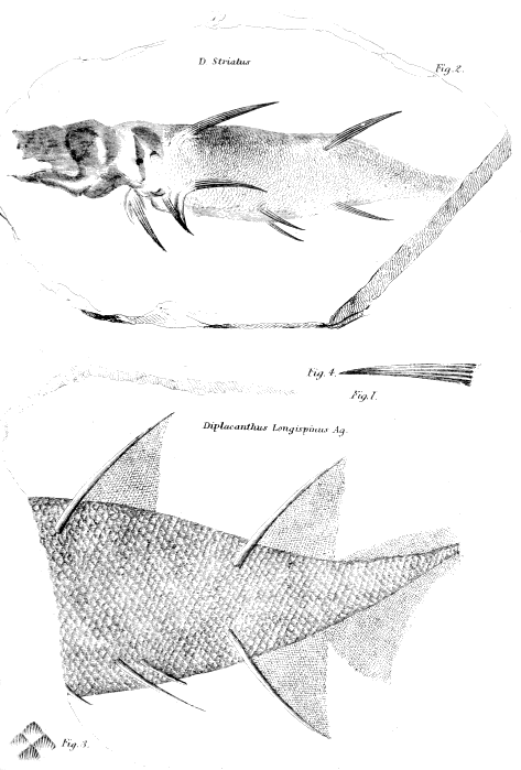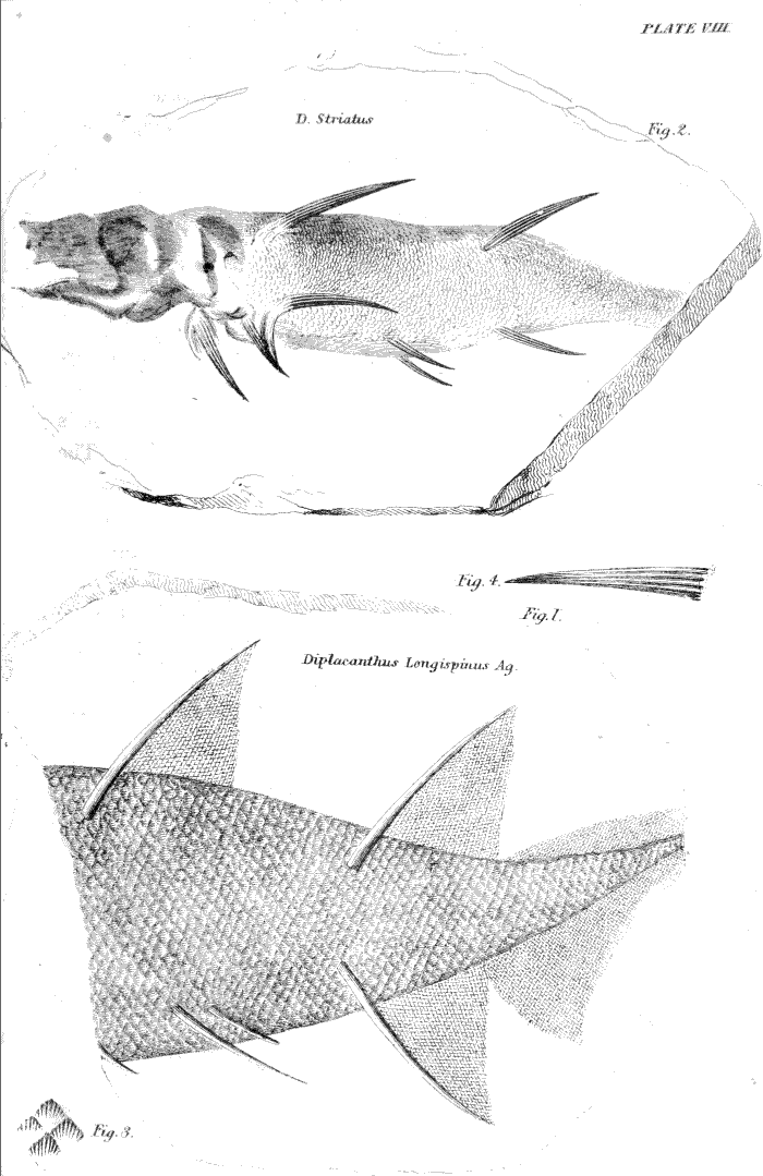 Plate VIII.—Fig. 1, Diplacanthus longispinus. Fig. 2, Diplacanthus striatus. Fig. 3, Magnified scales of fig. 1. Fig. 4, Spine of fig. 2, slightly magnified.