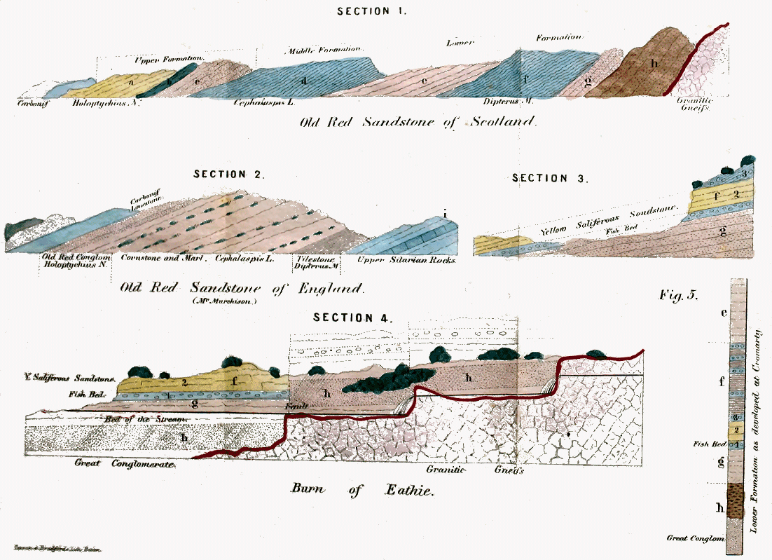 Smith, the father of English Geology, loved to remark that he had been born upon the Oolite—the formation whose various deposits he was the first to distinguish and describe, and from which, as from the meridian line of the geographer, the geological scale has been graduated on both sides. I [vi] have thought of the circumstance when, on visiting in my native district the birthplace of the author of the Silurian System, I found it situated among the more ancient fossiliferous rocks of the north of Scotland—the Lower Formation of the Old Red Sandstone spreading out beneath and around it, and the first-formed deposit of the system, the Great Conglomerate, rising high on the neighboring hills. It is unquestionably no slight advantage to be placed, at that early stage of life, when the mind collects its facts with greatest avidity, and the curiosity is most active, in localities where there is much to attract observation that has escaped the notice of others. Like the gentleman whom I have now the honor of addressing, I too was born on the Old Red Sandstone, and first broke ground as an inquirer into geological fact in a formation scarce at all known to the geologist, and in which there still remains much for future discoverers to examine and describe. Hence an acquaintance, I am afraid all too slight, with phenomena which, if intrinsically of interest, may be found to have also the interest of novelty to recommend them, and with organisms which, though among the most ancient of things in their relation to the world's history, will be pronounced new by the geological reader in their relation to human knowledge. Hence, too, my present opportunity of subscribing myself, as the writer of a volume on the Old Red Sandstone,