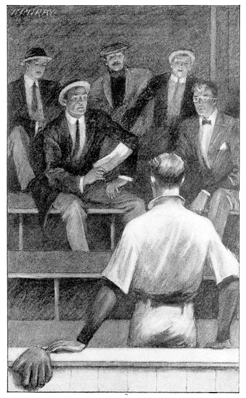 He was dressing hastily, taking little part in the boisterous celebration in the club house. The players, relieved suddenly from the strain, half-hysterical with joy over their victory, wrestled, pushed each other into the big swimming plunge, pounded each other with wet towels and hurled shoes and bats against the lockers in sheer delirium of gladness. They hugged each other, while each, trying to lift his voice above the others, yelled praise of the playing the others had done during the game. Larry, dressing rapidly at his locker, strove to escape unnoticed. Over on the opposite side of the row of lockers Harry Baldwin was dressing in sullen silence. He had not been allowed to have a part in the great game, and a sense of injustice rankled within him. Mentally he charged Larry Kirkland with treating him unfairly, although the truth was, Larry had forgotten him entirely, although he knew Helen Baldwin and her friends were waiting for Harry to dress. He must see Helen a moment before Harry joined her to tell her his plan. He threw his coat over his arm and hastened toward the door, hoping to escape unseen. The one thing he dreaded above all others was bidding good-bye to the fellows of the team. He feared if he attempted to say farewell he would break down. A lump was in his throat. He wondered whether they would miss him. He had resolved not to remain for commencement, not even to wait to receive the cherished C.