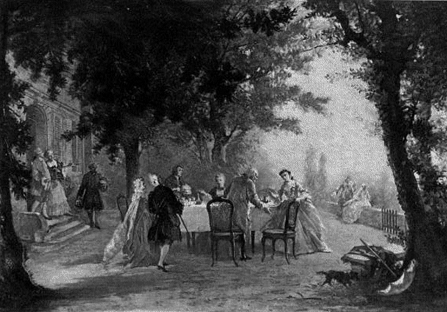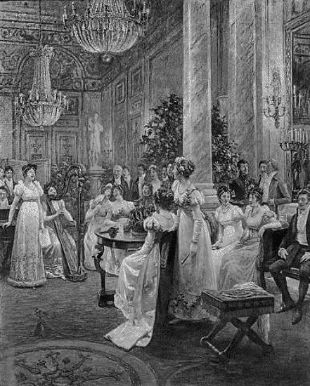 Marguerite d'Angoulême, Queen of Navarre, reading the Heptameron to her brother, Francis I, Marguerite of Valois at the coronation of Marie de Medici, Mme. du Chatelet protecting Voltaire, Mme. de Pompadour and a clerical lobbyist, A garden party under Marie Antoinette at Trianon, Mme. Recamier's salon, |