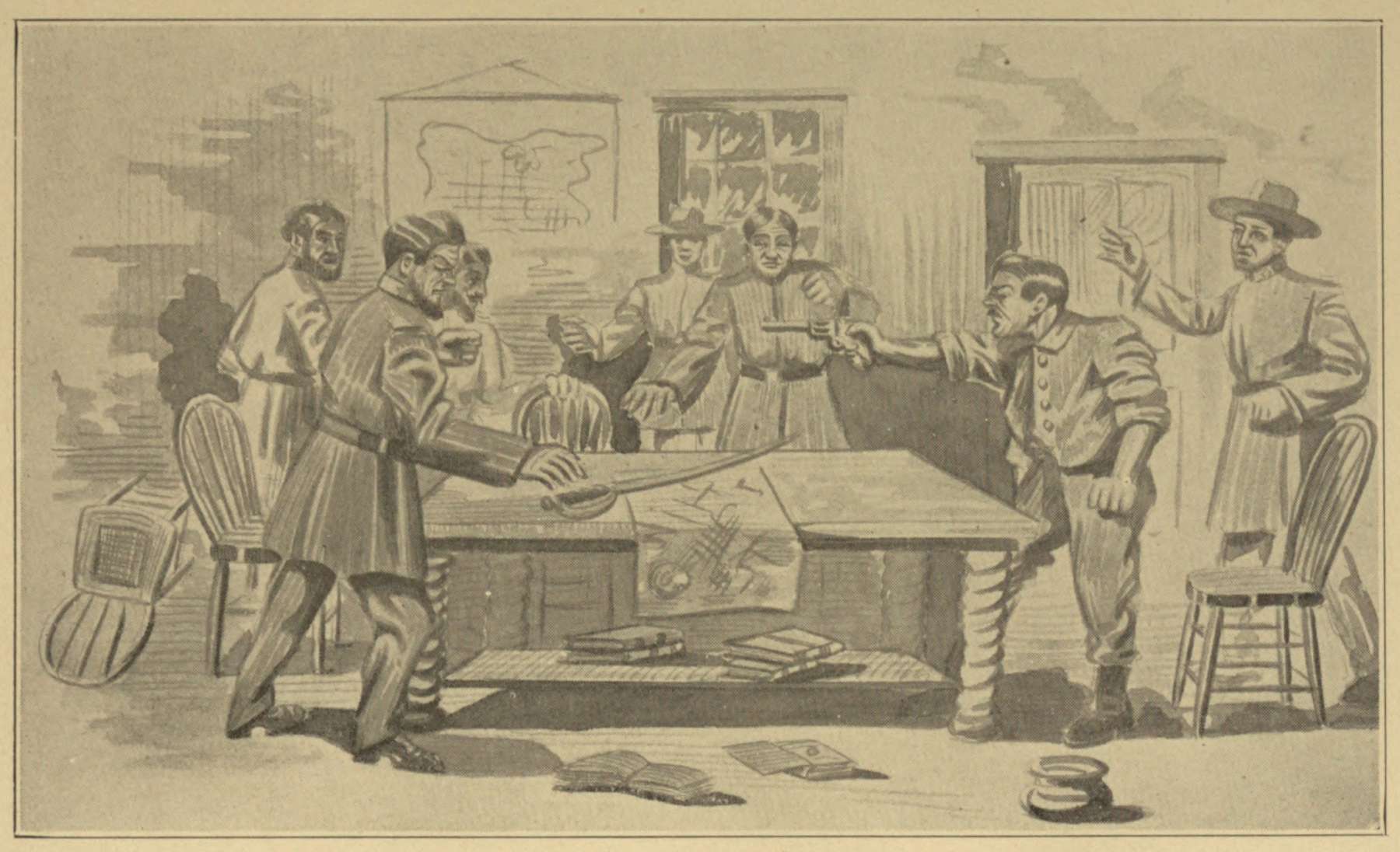 A conference was held among the officers as to what was best to be done. Parson claimed to be in sympathy with the South, and he knew that we would not be able to carry out our design, and that we would all perish, so he put out to lead us out of our dilemma. Major Thompson was for putting the Parsons under arrest, and force them to lead us in the direction[25] we first assumed, or perish with us. Parsons spoke up and said, "Gentlemen, I am in your power; the country through which you propose to travel is not habitable, I have been raised in these regions, and there is not a living soul within forty miles in the direction you propose to go, and at the rate you are compelled to advance, you would all perish to death, and your carcasses left for food to the wild beasts of the forest." The conference was divided, some hesitated, others were for adopting Major Thompson's plan, when the writer stepped forward, saying, "Gentlemen, up to now, I have obeyed orders, but I for one, prefer to be shot by an enemy's bullet, than to perish like a coward in this wild region." Captain Jones tapped me on the shoulder, remarking; "Well spoken, Hermann, those are my sentiments—Company E, About Face!". Captain Crump, commanding Company I, from Augusta, Ga., followed suit, and thus the whole column faced about, ready to follow the Parsons.
