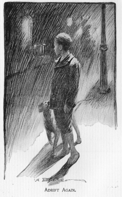 Heedless of wind and rain the boy lounged along the street. It was not often that he found himself in this section of the city, and it was much less familiar to him than some other localities. He seemed to be wandering aimlessly along, but his restless eyes were on the watch for some retired spot where he might safely examine his prize and see how much money he had secured. For a long time he saw no place that seemed to him a safe one for his purpose, so he went on and on until suddenly he realised that he was tired. He was passing a large brownstone church at the moment, and he sat down on the steps to rest.