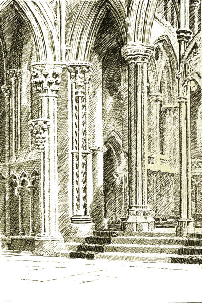 [88] It is a fine late Romanesque building, quite moderate in scale. For five bays extend nave and aisles, and the square chancel is flanked by small towers which become octagonal above the roof. (These are a characteristic German feature, and recall Trier or Mainz, but this Visby church has no resemblance to any existing building in Lübeck.) Pillars of some variety with figure-and leaf-carved caps sustain the triple vault, nor is the centre carried higher than the aisles. The great south door, six times recessed with shafts both round and square, is a magnificent example of what in England is called Norman work. There are many such fine doorways in the town, but no other is as good as this. Rather later than the rest a great west tower was built, and on the northern side it has a gallery open by a rich arcade.
