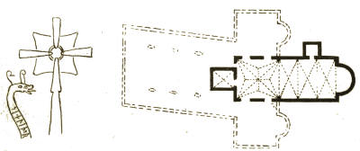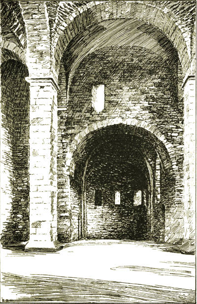 [83] The square nave and four pillars were preserved, but instead of being close to the corners the columns were so spaced that the nine compartments of the vaulting should be practically equal squares. The vaulting ribs or arches, three against each wall, now look into the roofless nave. Not quite in the centre of the middle one on the east a round arch opens into the roofless chancel with horseshoe apse. A two-bay chapel projects on the south, and westward is a huge oblong tower with stairways in the thickness of its north and southern walls.