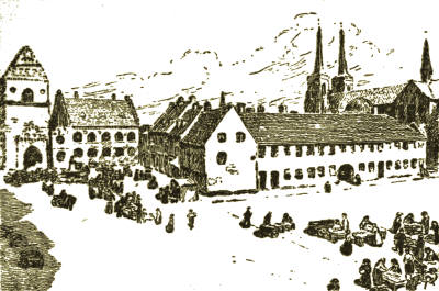 In the grounds of the Burgomaster's House are some remains of the Kalfskinshuset, which seems to have been built originally in the early fourteenth century, the land being secured by making a calf's skin cover a fair area by cutting it into strings, much as was done with an ox-skin at Carthage. The owner of the ground when making the arrangement imagined he was only parting with about one square yard.