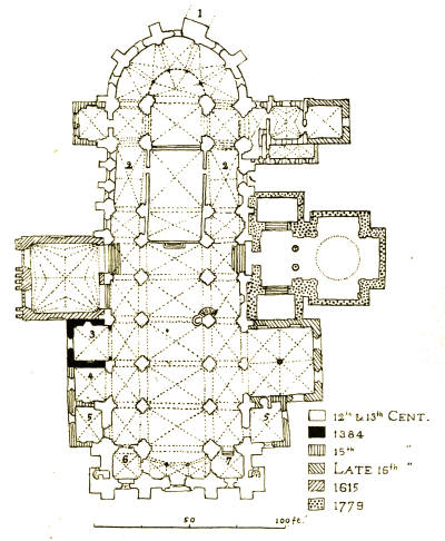 [89] At first sight the remains of Romanesque work are by no means clear, but the spacing of the pillars through the seven bays is exceedingly irregular, and on the south by the ruined cloister is an older chapel, the vault below quadripartite, above a tunnel. This church was finally consecrated, it seems, only in 1412, and it is apparently the only important mediæval building which is subsequent in date to the raid of 1361. The tower stood at the west end till 1885, and then it had to be removed or it would have tumbled down.