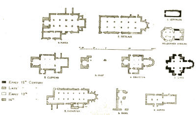 These square churches are extraordinarily interesting to the student of architecture from the fact that they display Byzantine forms exercising an influence on the development of Gothic in the far north of Europe. Unfortunately the new idea does not seem to have spread beyond the island, but it is full of suggestion for small town churches at the present day, especially where the site is awkward and cramped.