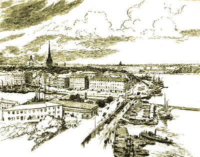 [113] The names of the nine islands are these: Stadsholmen (on which was the original settlement), Kungsholmen, Riddarsholmen, Helgeandsholmen, Skeppsholmen, Kastellholmen, Stromsborg, Djurgarden, Beckholmen. They are of extremely unequal size. The greater part of the city is on the mainland north and south, and the suburbs spread on to an indefinite number of other islands.