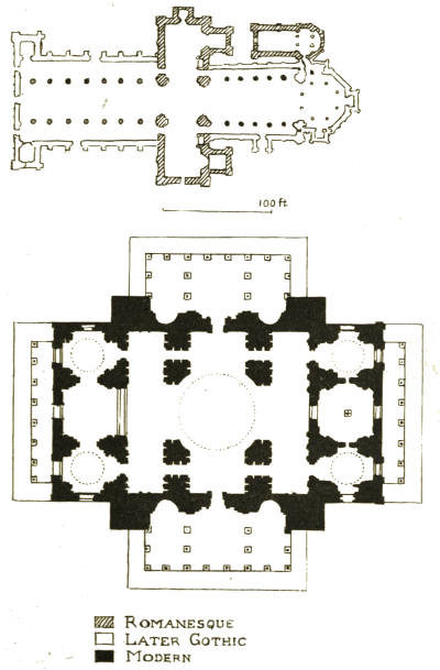 [87] There are a few British instances of Romanesque churches, square without and apsidal within. Such are the Oratory of St. Margaret in the Castle at Edinburgh, two chapels in Romsey Abbey, and one in the ruined Abbey at Shaftesbury. A Renaissance instance of the same thing exists in the Chapel of Clare College, Cambridge.