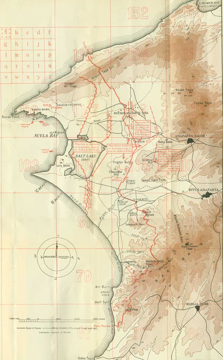 "Approximate position of troops under General Hammersley this morning. Two battalions 33rd Brigade sea to S.E. corner of Salt Lake: will be moved forward shortly to connect if possible with Anzac troops. Two battalions 33rd holding Yilghin Burnu. Position on Hill 500 yards East Yilghin Burnu not yet certain. From Yilghin Burnu 31st Brigade holds line through Baka Baba crossroads, thence North to about 118 0 2. 32nd and 34th Brigades ordered forward from Hill 10 (117 R) where they spent night to line 118 M.R.W. to fill gap with Tenth Division. Detailed information of Tenth Division not yet definite: will report later. Consider Major-General Hammersley and troops under him deserve great credit for result attained against strenuous opposition and great difficulty."