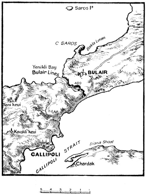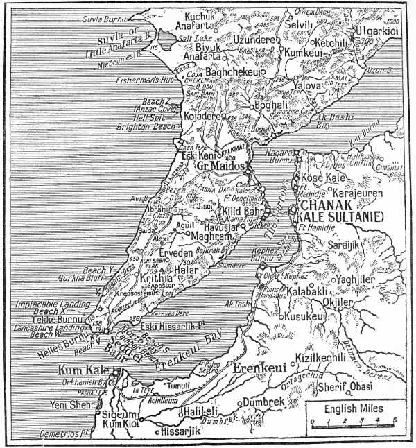 By that time I had already carried out a preliminary reconnaissance of the north-western shore of the Gallipoli Peninsula, from its isthmus, where it is spanned by the Bulair fortified lines, to Cape Helles, at its extremest point. From Bulair this singular feature runs in a south-westerly direction for 52 miles, attaining near its centre a breadth of 12 miles. The northern coast of the northern half of the promontory slopes downwards steeply to the Gulf of Xeros, in a chain of hills, which extend as far as Cape Sulva. The precipitous fall of these hills precludes landing, except at a few narrow gullies, far too restricted for any serious military movements. The southern half of the peninsula is shaped like a badly-worn boot. The ankle lies between Gaba Tepe and Kalkmaz Dagh; beneath the heel lie the cluster of forts at Kilid Bahr; whilst the toe is that promontory, five miles in width, stretching from Tekke Burnu to Sedd-el-Bahr.