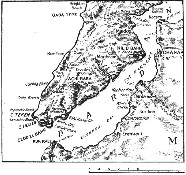Altogether the result of this and subsequent reconnaissances was to convince me that nothing but a thorough and systematic scheme for flinging the whole of the troops under my command very rapidly ashore could be expected to meet with success; whereas, on the other hand, a tentative or piecemeal programme was bound to lead to disaster. The landing of an army upon the theatre of operations I have described—a theatre strongly garrisoned throughout, and prepared for any such attempt—involved difficulties for which no precedent was forthcoming in military history except possibly in the sinister legends of Xerxes. The beaches were either so well defended by works and guns or else[Pg 5] so restricted by nature that it did not seem possible, even by two or three simultaneous landings, to pass the troops ashore quickly enough to enable them to maintain themselves against the rapid concentration and counter-attack which the enemy was bound in such case to attempt. It became necessary, therefore, not only to land simultaneously at as many points as possible, but to threaten to land at other points as well. The first of these necessities involved another unavoidable if awkward contingency, the separation by considerable intervals of the force.