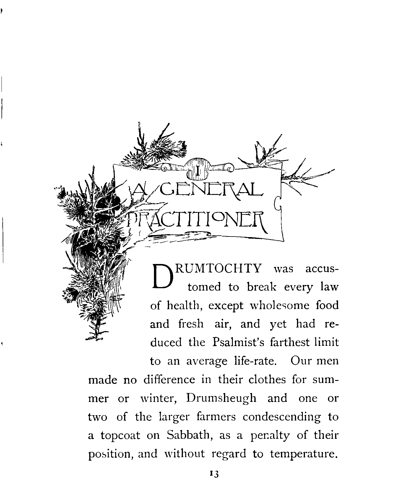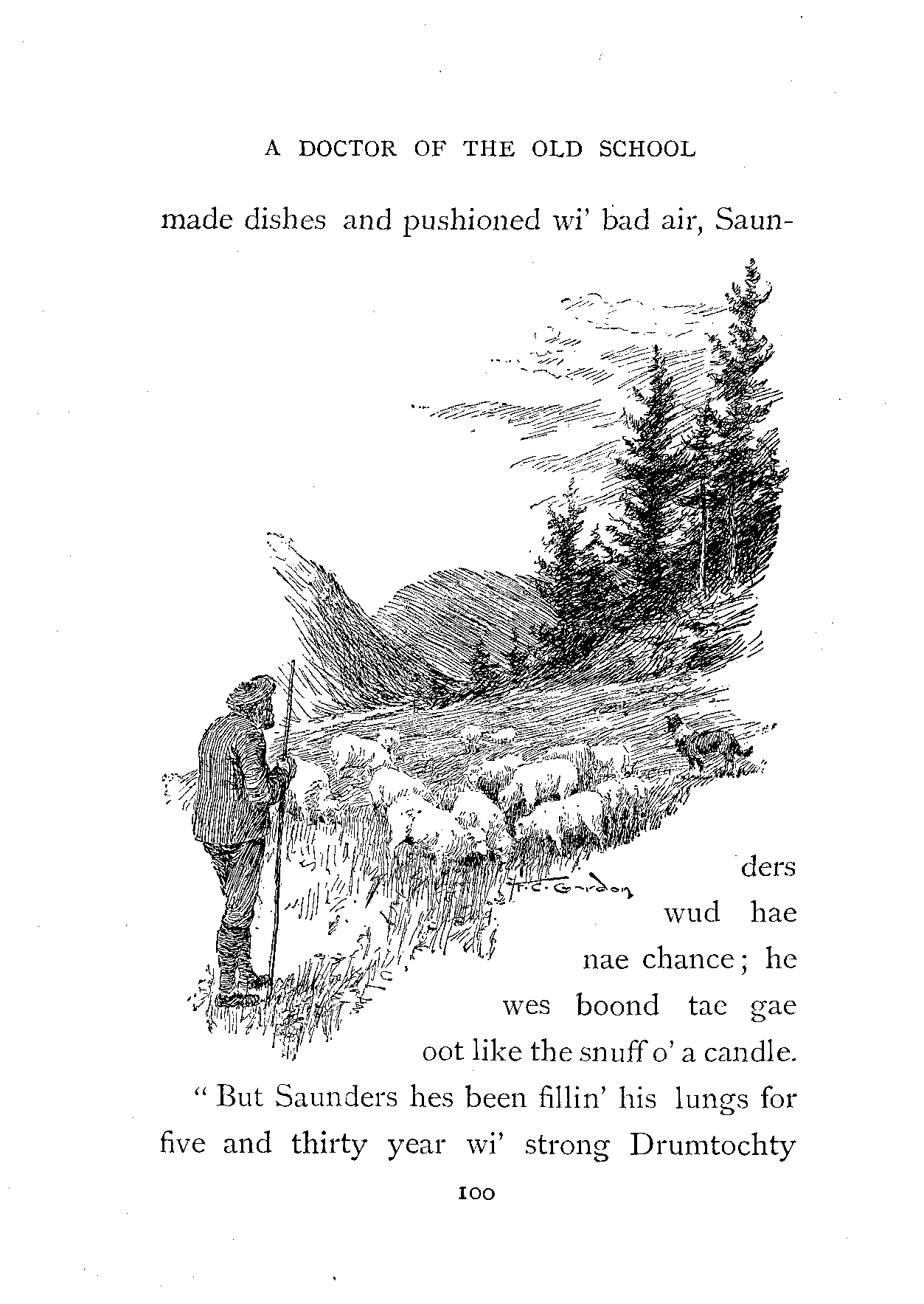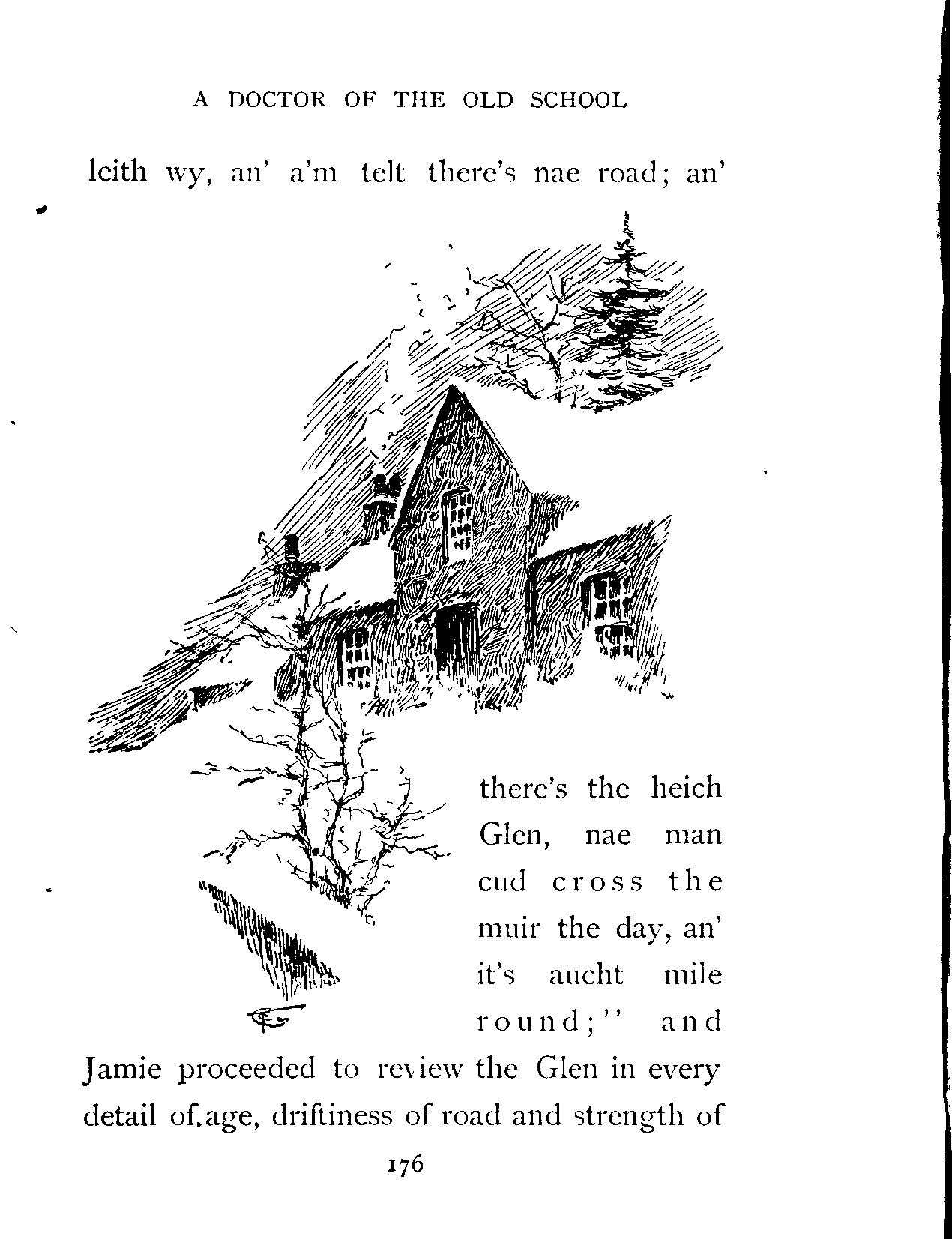 “Ye see,” said Jamie, who had been counting heads all morning, “there's six shepherds in Glen Urtaeh—they're shut up fast; an' there micht hae been a gude half dizen frae Dunleith wy, an' a'm telt there's nae road; an' there's the heich Glen, nae man cud cross the muir the day, an' it's aucht mile round;” and Jamie proceeded to review the Glen in every detail of age, driftiness of road and strength of body, till we arrived at the doctor's cottage, when he had settled on a reduction of fifty through stress of weather.