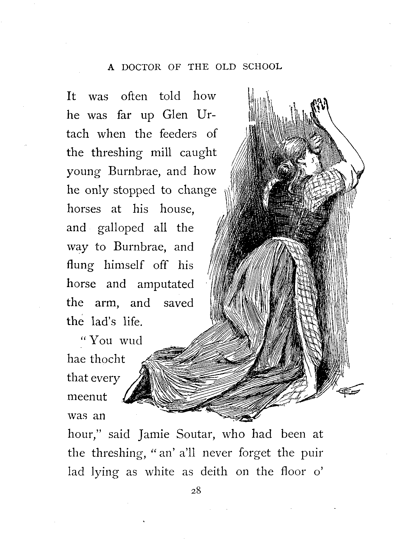 “It's nae ceremony the day, ye may lippen tae it; it's the hert brocht the fouk, an' ye can see it in their faces; ilka man hes his ain reason, an' he's thinkin' on't though he's speakin' o' naethin' but the storm; he's mindin' the day Weelum pued him out frae the jaws o' death, or the nicht he savit the gude wife in her oor o' tribble.