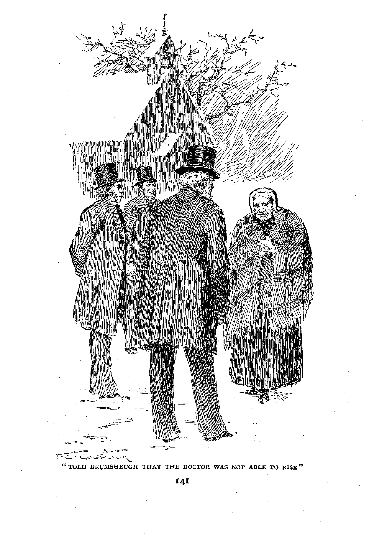 “You make too much of it, Drumsheugh,” and the clear, firm voice was heard of all; “it would have taken more than a few snow drifts to keep me from showing my respect to William MacLure's memory.” When all had gathered in a half circle before the kitchen door, Lord Kilspindie came out—every man noticed he had left his overcoat, and was in black, like the Glen—and took a place in the middle with Drumsheugh and Burnbrae, his two chief tenants, on the right and left, and as the minister appeared every man bared his head.