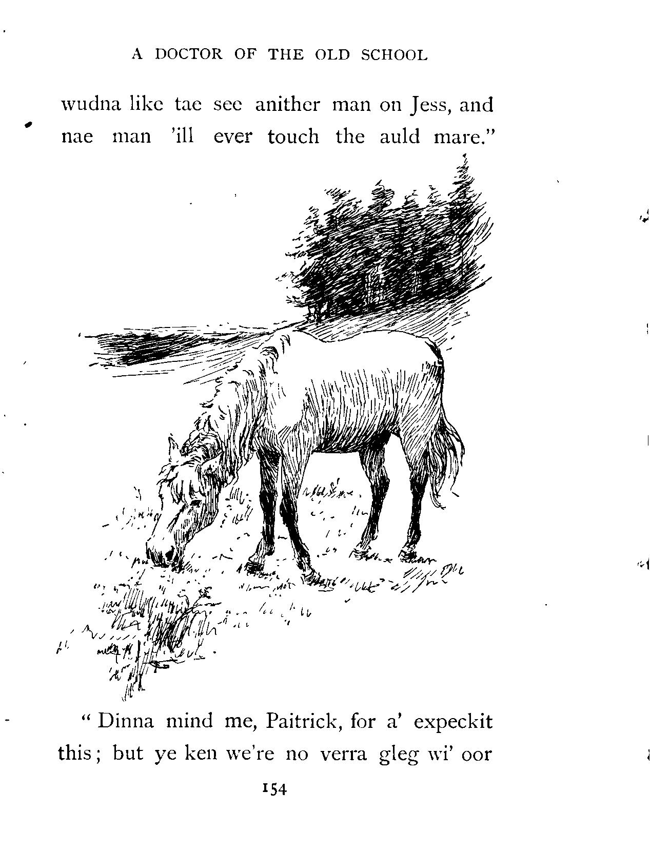 He recommended that she should be shot to end her misery, but no man could be found in the Glen to do the deed and Jess relieved them of the trouble. When Drumsheugh went to the stable on Monday morning, a week after Dr. MacLure fell on sleep, Jess was resting at last, but her eyes were open and her face turned to the door.