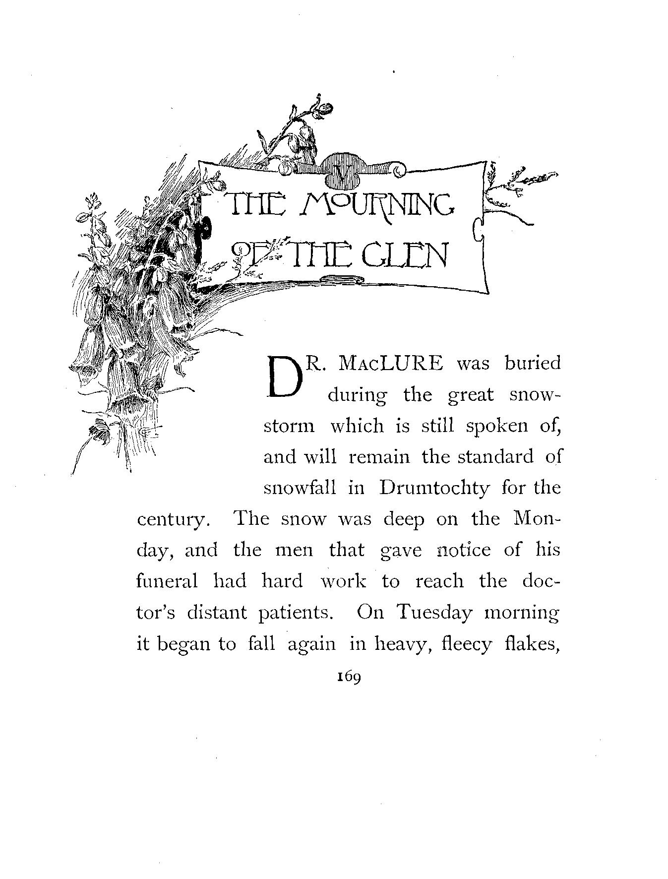 Dr. MacLure was buried during the great snowstorm which is still spoken of, and will remain the standard of snowfall in Drumtochty for the century. The snow was deep on the Monday, and the men that gave notice of his funeral had hard work to reach the doctor's distant patients. On Tuesday morning it began to fall again in heavy, fleecy flakes, and continued till Thursday, and then on Thursday the north wind rose and swept the snow into the hollows of the roads that went to the upland farms, and built it into a huge bank at the mouth of Glen Urtach, and laid it across our main roads in drifts of every size and the most lovely shapes, and filled up crevices in the hills to the depth of fifty feet.