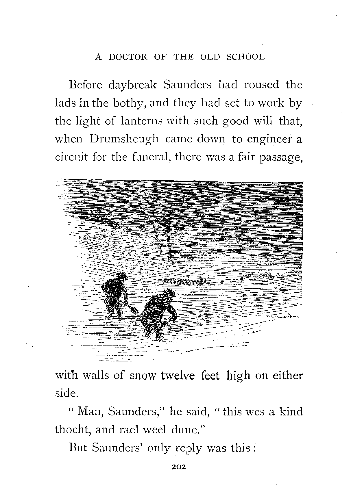 There was only one drift on the road between his cottage and the kirkyard, and it had been cut early that morning. Before daybreak Saunders had roused the lads in the bothy, and they had set to work by the light of lanterns with such good will that, when Drumsheugh came down to engineer a circuit for the funeral, there was a fair passage, with walls of snow twelve feet high on either side.