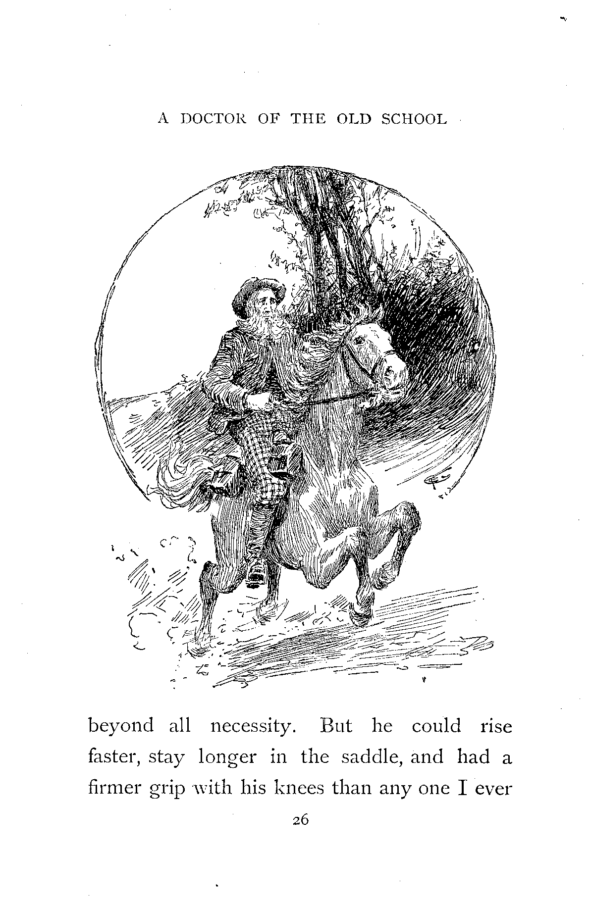 One horse could not do the work of this man, but we liked best to see him on his old white mare, who died the week after her master, and the passing of the two did our hearts good. It was not that he rode beautifully, for he broke every canon of art, flying with his arms, stooping till he seemed to be speaking into Jess's ears, and rising in the saddle beyond all necessity. But he could rise faster, stay longer in the saddle, and had a firmer grip with his knees than any one I ever met, and it was all for mercy's sake. When the reapers in harvest time saw a figure whirling past in a cloud of dust, or the family at the foot of Glen Urtach, gathered round the fire on a winter's night, heard the rattle of a horse's hoofs on the road, or the shepherds, out after the sheep, traced a black speck moving across the snow to the upper glen, they knew it was the doctor, and, without being conscious of it, wished him God speed.