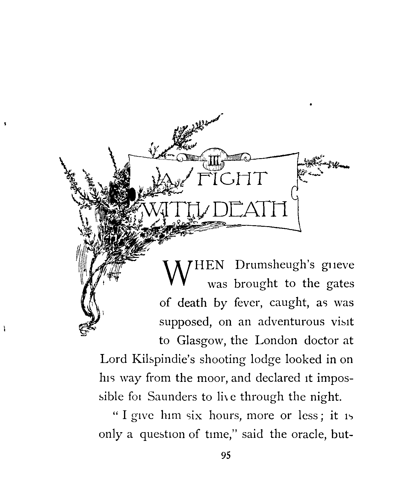 When Drumsheugh's grieve was brought to the gates of death by fever, caught, as was supposed, on an adventurous visit to Glasgow, the London doctor at Lord Kilspindie's shooting lodge looked in on his way from the moor, and declared it impossible for Saunders to live through the night.