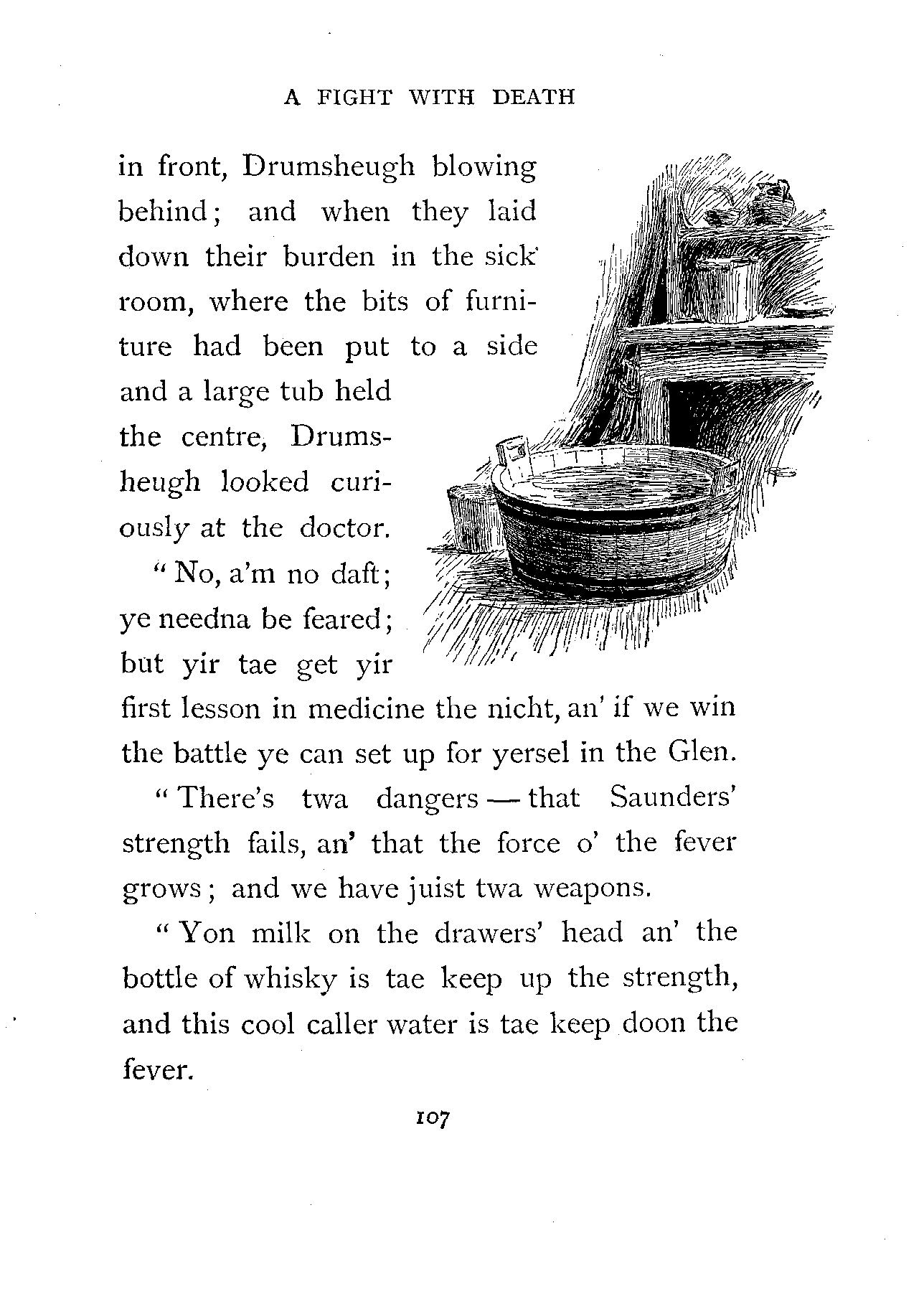 "'Aff wi' yir coat, Drumsheugh,' said MacLure; 'ye 'ill need tae bend yir back the nicht; gither a' the pails in the hoose and fill them at the spring, an' a'll come doon tae help ye wi' the carryin'.'"