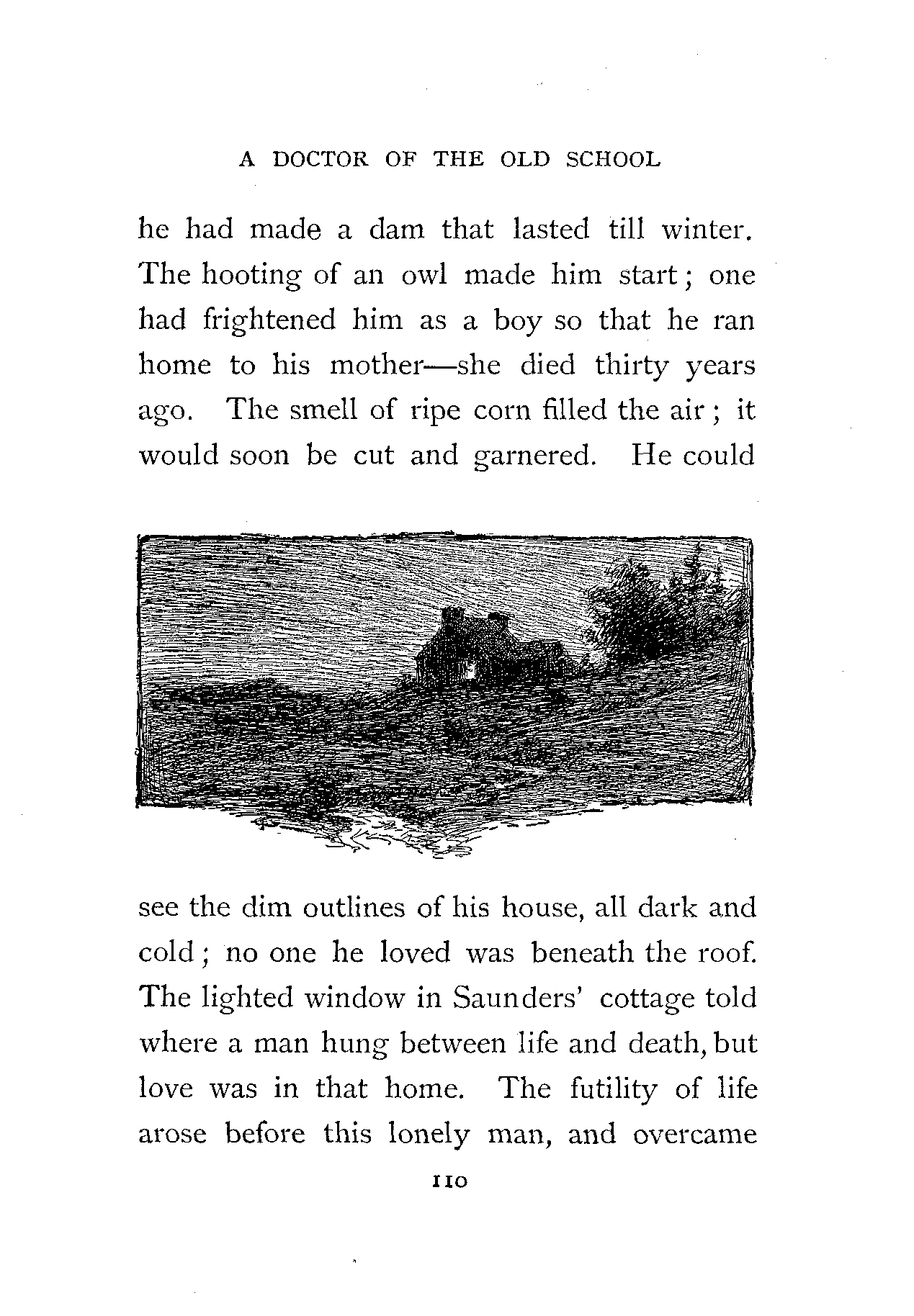 It was the hour before daybreak, and Drumsheugh wandered through fields he had trodden since childhood. The cattle lay sleeping in the pastures; their shadowy forms, with a patch of whiteness here and there, having a weird suggestion of death. He heard the burn running over the stones; fifty years ago he had made a dam that lasted till winter. The hooting of an owl made him start; one had frightened him as a boy so that he ran home to his mother—she died thirty years ago. The smell of ripe corn filled the air; it would soon be cut and garnered. He could see the dim outlines of his house, all dark and cold; no one he loved was beneath the roof. The lighted window in Saunders' cottage told where a man hung between life and death, but love was in that home. The futility of life arose before this lonely man, and overcame his heart with an indescribable sadness. What a vanity was all human labour, what a mystery all human life.