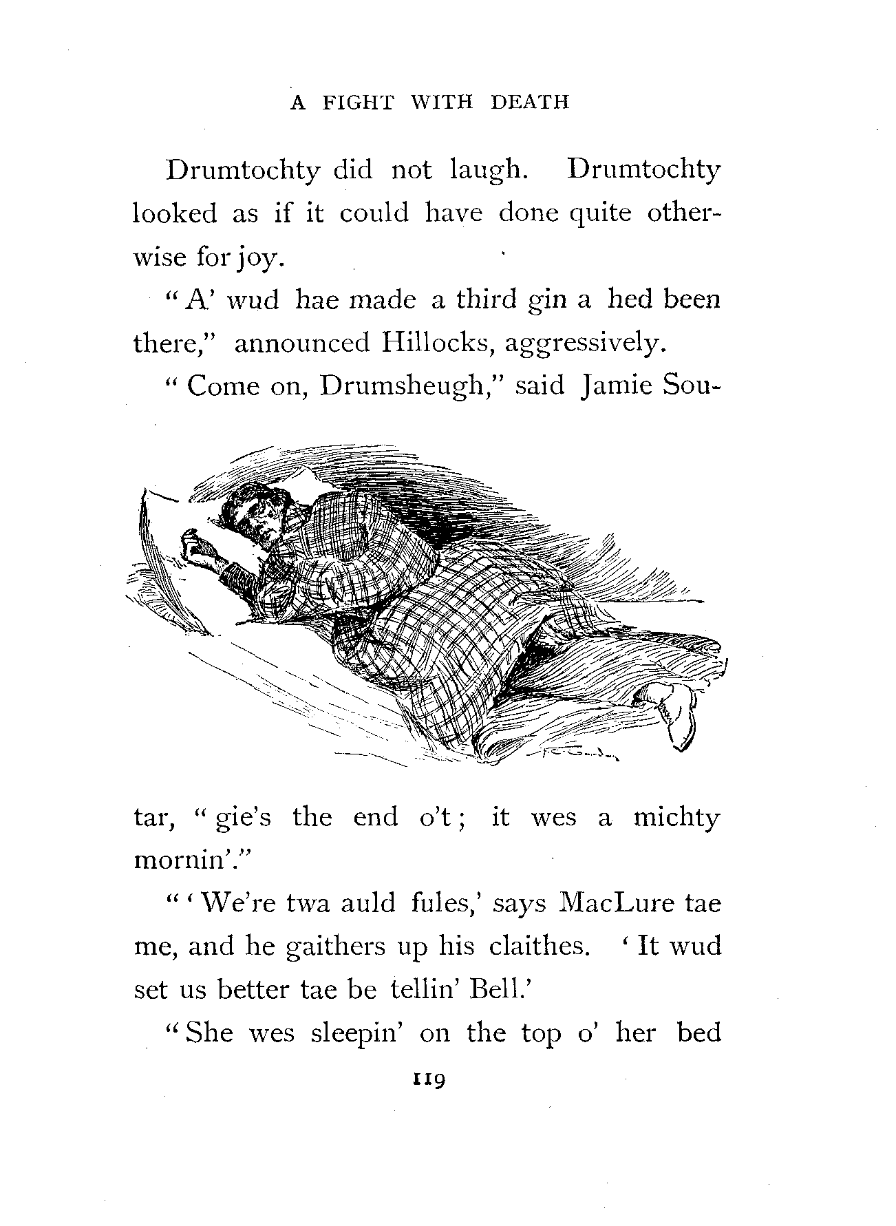 "It gar'd ma very blood rin faster tae the end of ma fingers juist tae look at him," Drumsheugh expatiated afterwards to Hillocks, "for a' saw noo that there was tae be a stand-up fecht atween him an' deith for Saunders, and when a' thocht o' Bell an' her bairns, a' kent wha wud win.